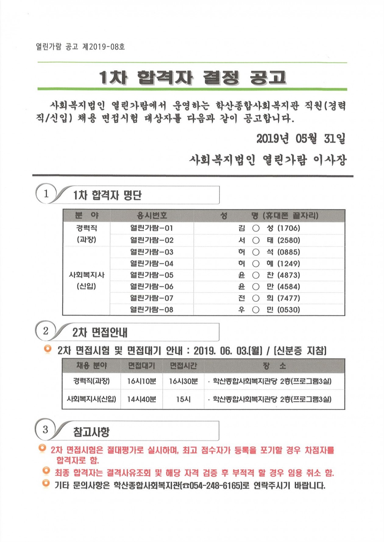 2019년도 사회복지법인 열린가람 학산종합사회복지관 경력직/신입 직원(사회복지사) 채용 1차 합격자 결정 공고
