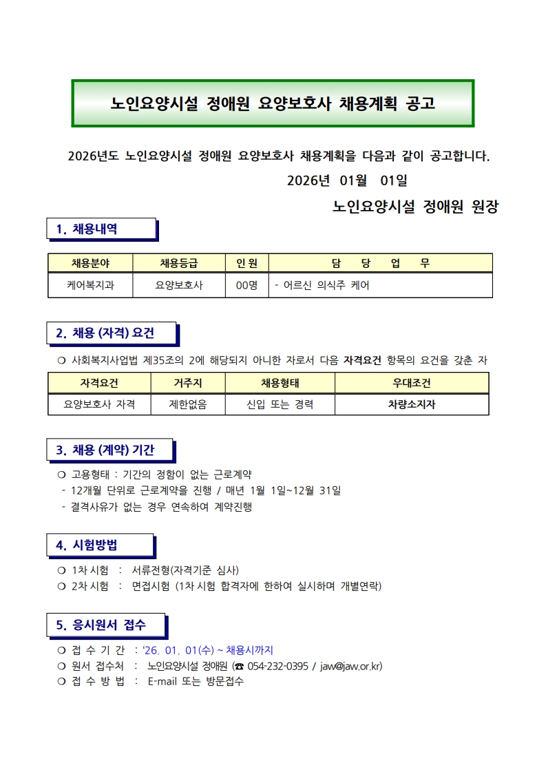 2026년 1월 노인요양시설 정애원 요양보호사 채용공고