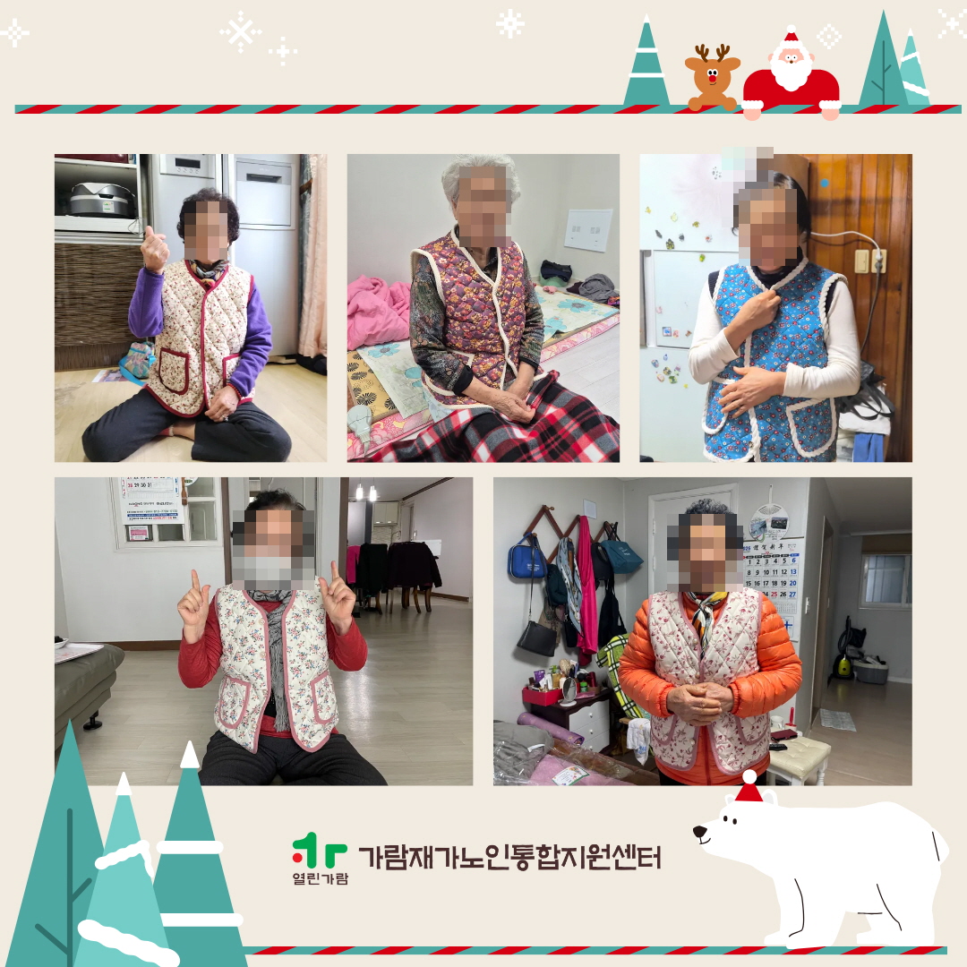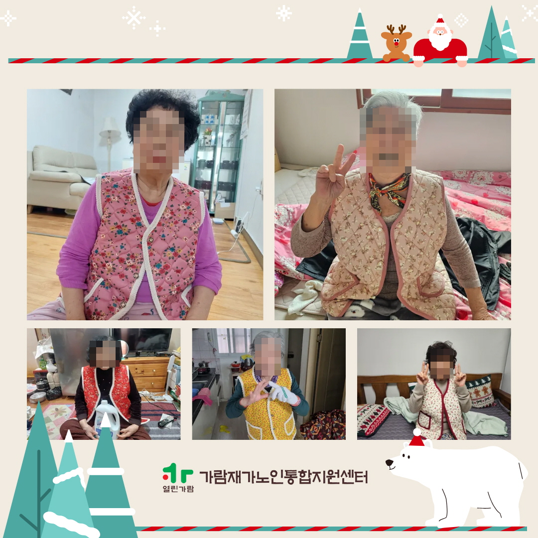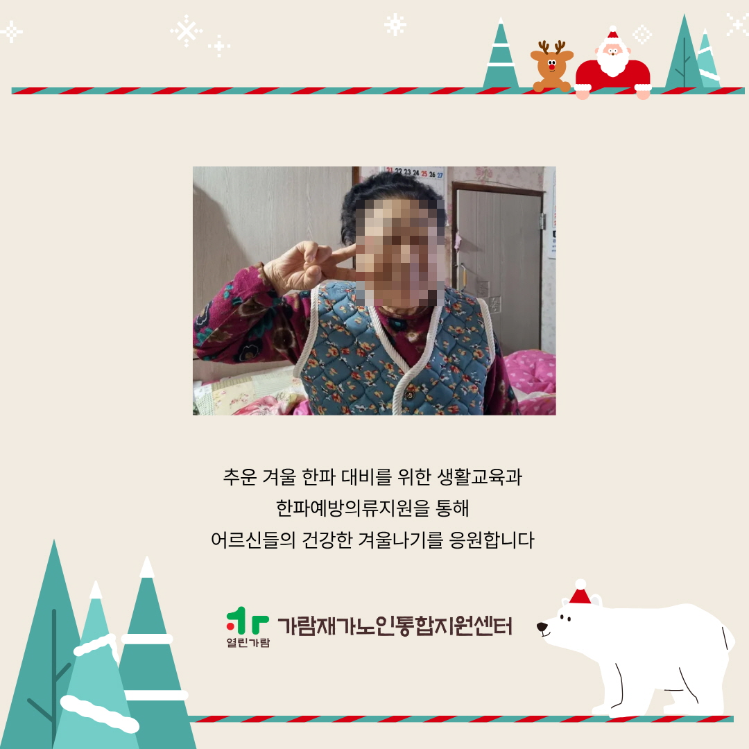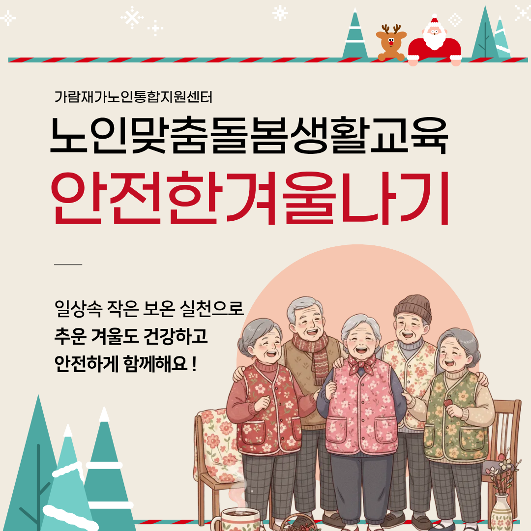 가람재가노인통합지원센터 노인맞춤돌봄서비스 한파대비 생활교육 「안전한 겨울나기」 가람재가노인통합지원센터 노인복지사업 0 10 01.05 13:16 가람재가노인통합지원센터 노인맞춤돌봄서비스 한파대비 생활교육 「안전한 겨울나기」겨울철 한파로 인한 건강 위험을 예방하고,어르신들께서 일상 속에서 실천할 수 있는 보온 생활수칙을 안내하기 위해 한파대비 생활교육을 진행하였습니다.또한 한파 예방을 위한 보온 의류(조끼)를 함께 지원하여 추운 겨울에도 어르신들이 보다 따뜻하고 건강하게 생활하실 수 있도록 돕고자 합니다.앞으로도 어르신의 안전하고 건강한 일상을 위해 노인맞춤돌봄서비스는 계속 함께하겠습니다.