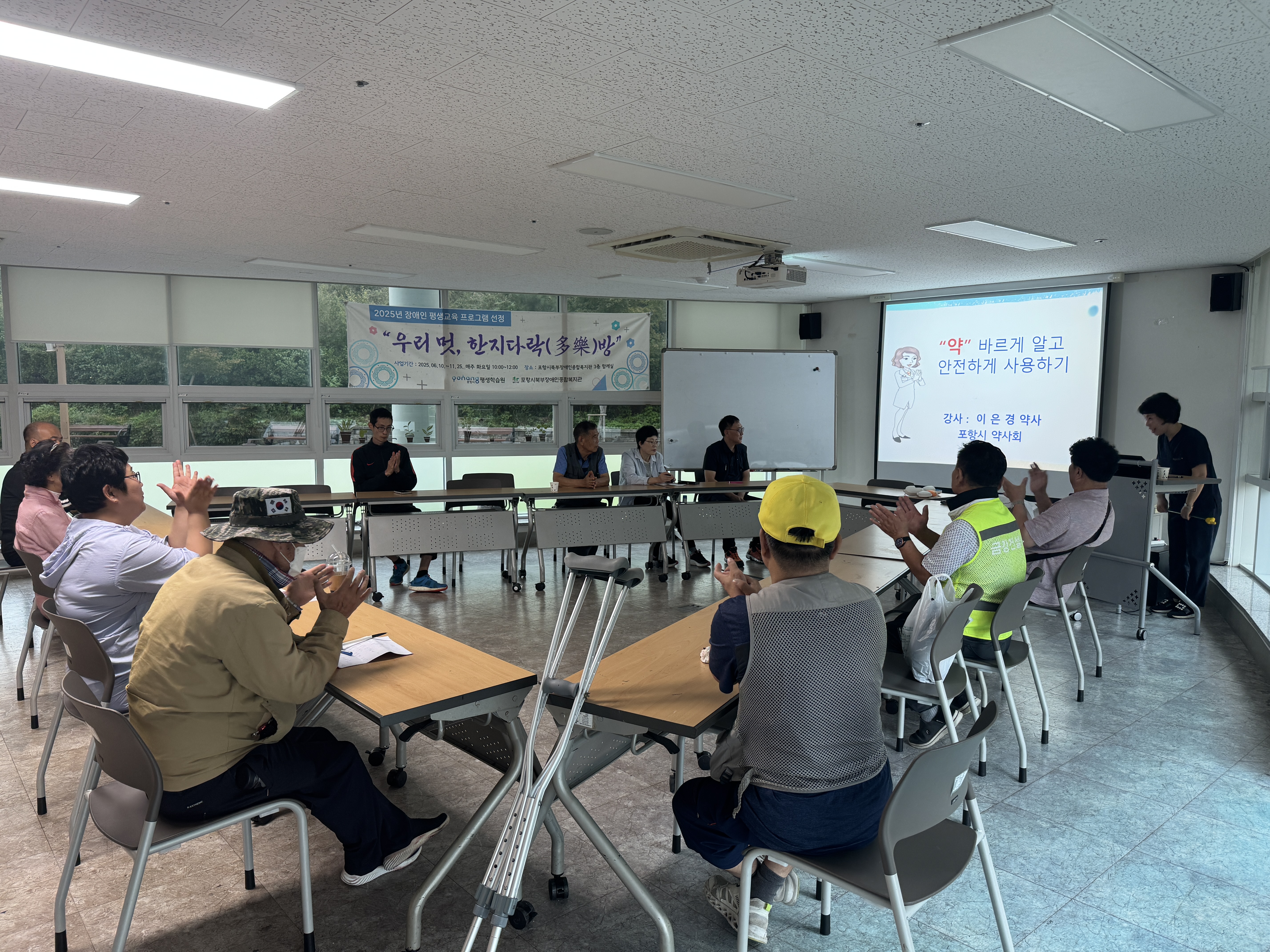 3차 장애인당사자 역량강화교육 실시 포항북부장애인복지관 장애인복지사업 0 47 09.30 14:33 <2025년 제 3차 장애인당사자 역량강화교육 실시>2025년 9월 24일 경상북도지역장애인보건의료센터, 경상북도 포항의료원과 연계하여 이용자분들과 함께 약물복용 교육(약물 오남용 예방, 약 복용의 중요성, 의약품 보관 방법)을 진행하였습니다.본인이 복용 중인 약봉지를 들고 와 약사에게 1:1 약물 관리 방법을 배우고, 복용 시 주의해서 섭취해야할 음식을 확인하는 등 주의사항 등 피드백 제공하여서 이용자들의 만족도가 매우 높은 교육이었습니다.