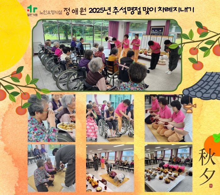 2025년 정애원 추석명절 맞이 차례지내기 정애원 노인복지사업 0 27 10.08 11:38 2025년 정애원 추석명절 맞이 차례지내기2025년 10월 06일, 풍요로운 한가위! 추석을 맞이 어르신들과 함께 차례를 지냈습니다. 한분씩 앞으로 나와 진심을 다해 절을 올리고 음복주 및 음식을 드셨습니다.
