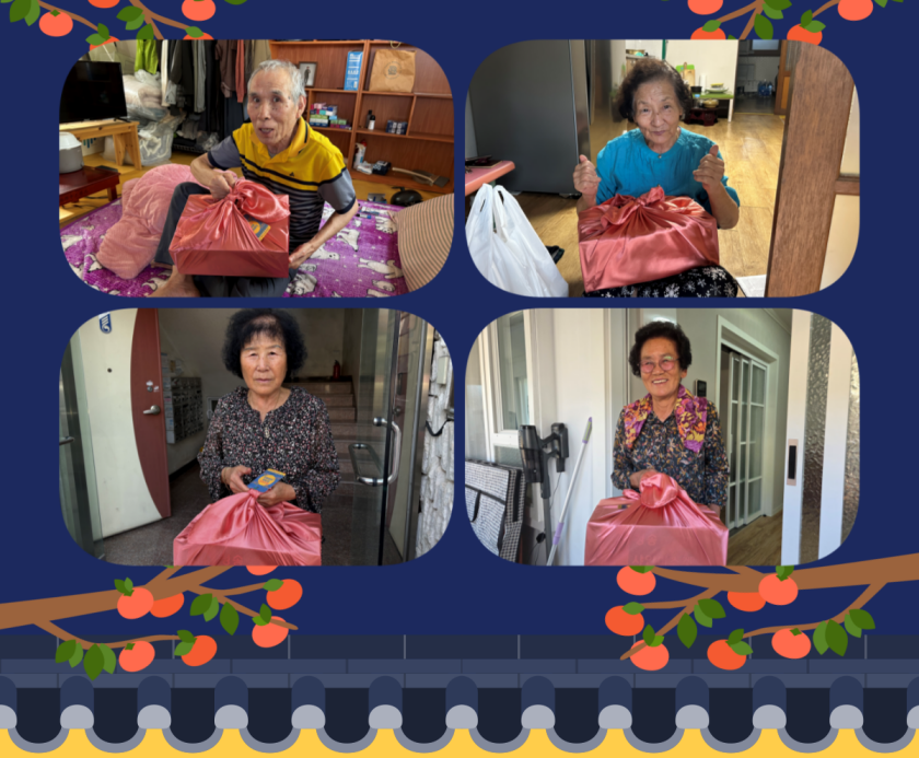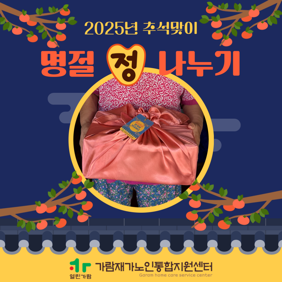 2025년 가람재가노인통합지원센터 추석맞이 명절 정 나누기 가람재가노인통합지원센터 노인복지사업 0 5 10.20 13:48 가람재가노인통합지원센터♥2025년 추석맞이 명절 정(情) 나누기♥재가노인통합지원서비스팀은 추석명절을 맞이하여 명절 정(情) 나누기 사업을 진행했습니다.직원과 사회복지현장실습생, 자원봉사자, 사회복무요원모두가 정성스런 마음을 담아 명절선물을 준비하고,어르신 댁에 방문하여 따뜻한 명절인사와 함께 선물을 전해드렸습니다.재가노인통합지원서비스팀은 어르신 모두 따뜻하고 풍성한 한가위 보내셨기를 바랍니다.