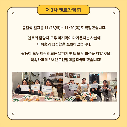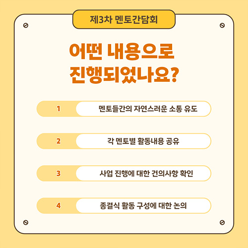 끝이 다가온다는 점에서 멘토와 담당자 모두 서운했지만 마지막 활동까지 최선을 다할 것을 약속하며 제3차 멘토간담회를 마쳤습니다.