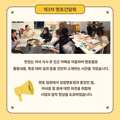 지난 11/5(수), 11/6(목) 외부 식당 및 카페에서 제3차 멘토간담회가 진행되었습니다.