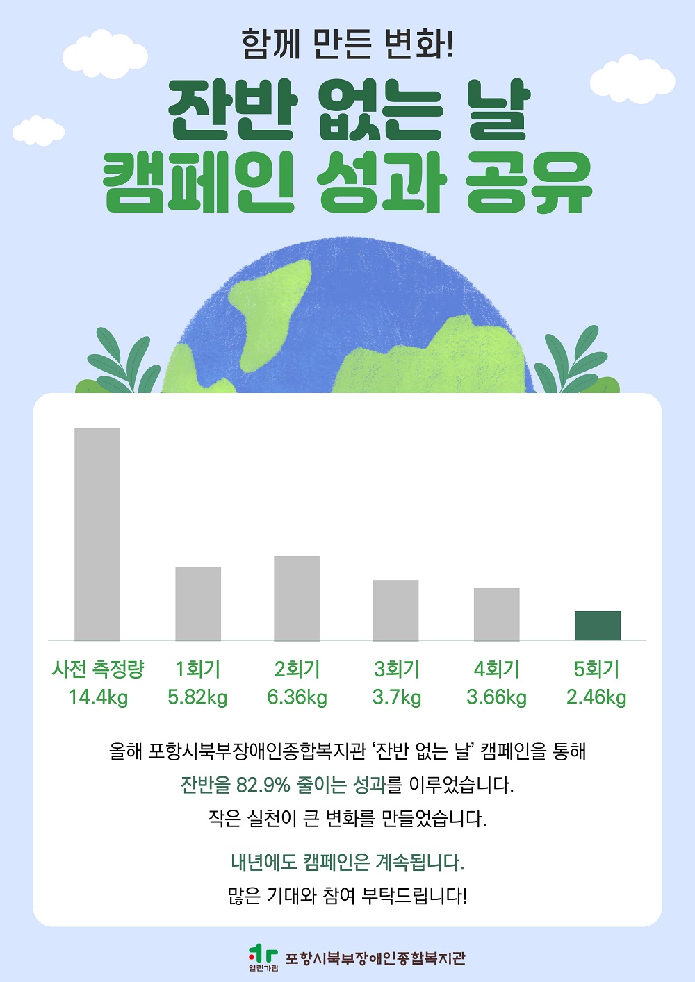 그 결과 음식물 쓰레기는 캠페인 시작 전 14.4kg에서 최종 2.46kg으로 약 82.9% 감소했습니다.