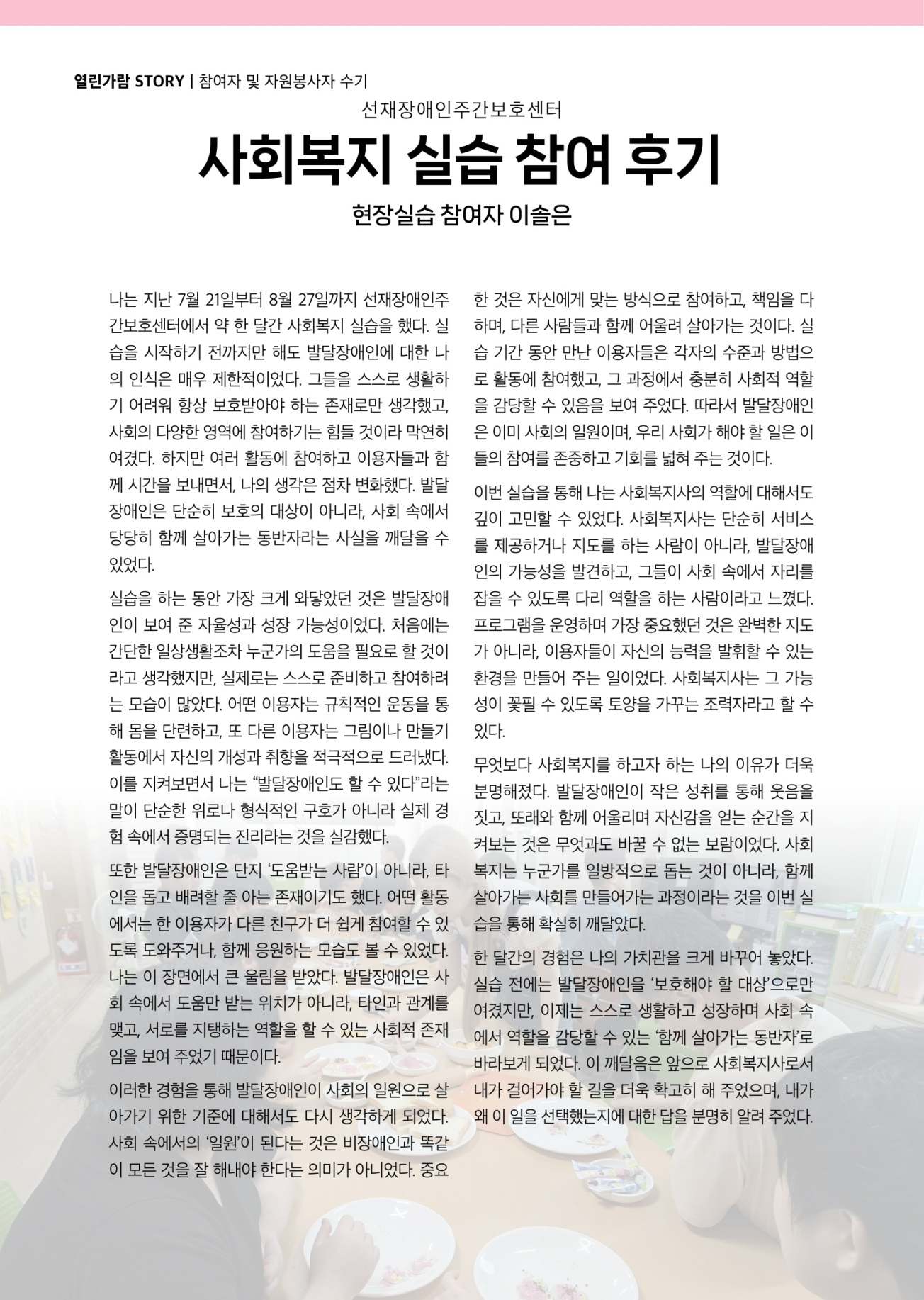 선재는 선하고 훌륭함을 일컫는 말로 사회복지법인 열린가람 및 산하시설에서 발행하는 분기 계간지 입니다.
