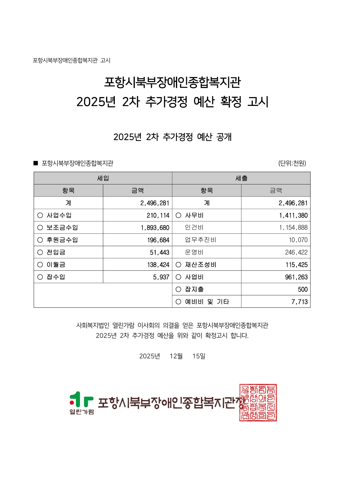포항시북부장애인종합복지관 2025년도 2차 추가경정 예산 확정 고시 포항북부장애인복지관 0 8 12.15 14:34 2025.12.15 14:34 2025년 2차추경 세부사업계획서 및 예산서포항시북부장애인종합복지관_공개.pdf (553.3K) + 1 {이미지:0}