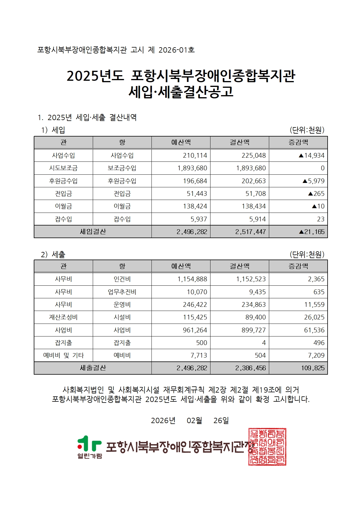 포항시북부장애인종합복지관 2025년 결산 및 후원금(품) 수입·사용 공개 포항북부장애인복지관 0 27 02.26 14:44 2026.03.03 09:36 2025년도 포항시북부장애인종합복지관 결산, 후원금품사용공개.pdf (8.1M) + 3
