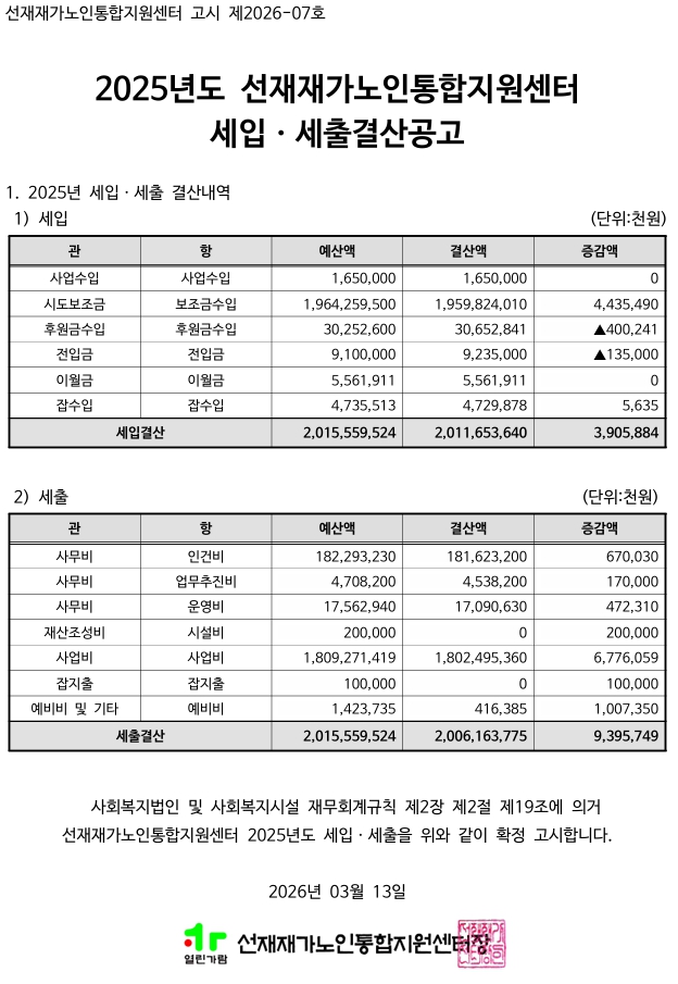 선재재가노인통합지원센터 2025년 결산 및 후원금(품) 수입·사용 공개 선재재가노인통합지원센터 0 6 8시간전 2026.03.13 09:52 선재재가노인통합지원센터 2025년 결산 및 후원금품수입사용공개.pdf (1.4M) + 0