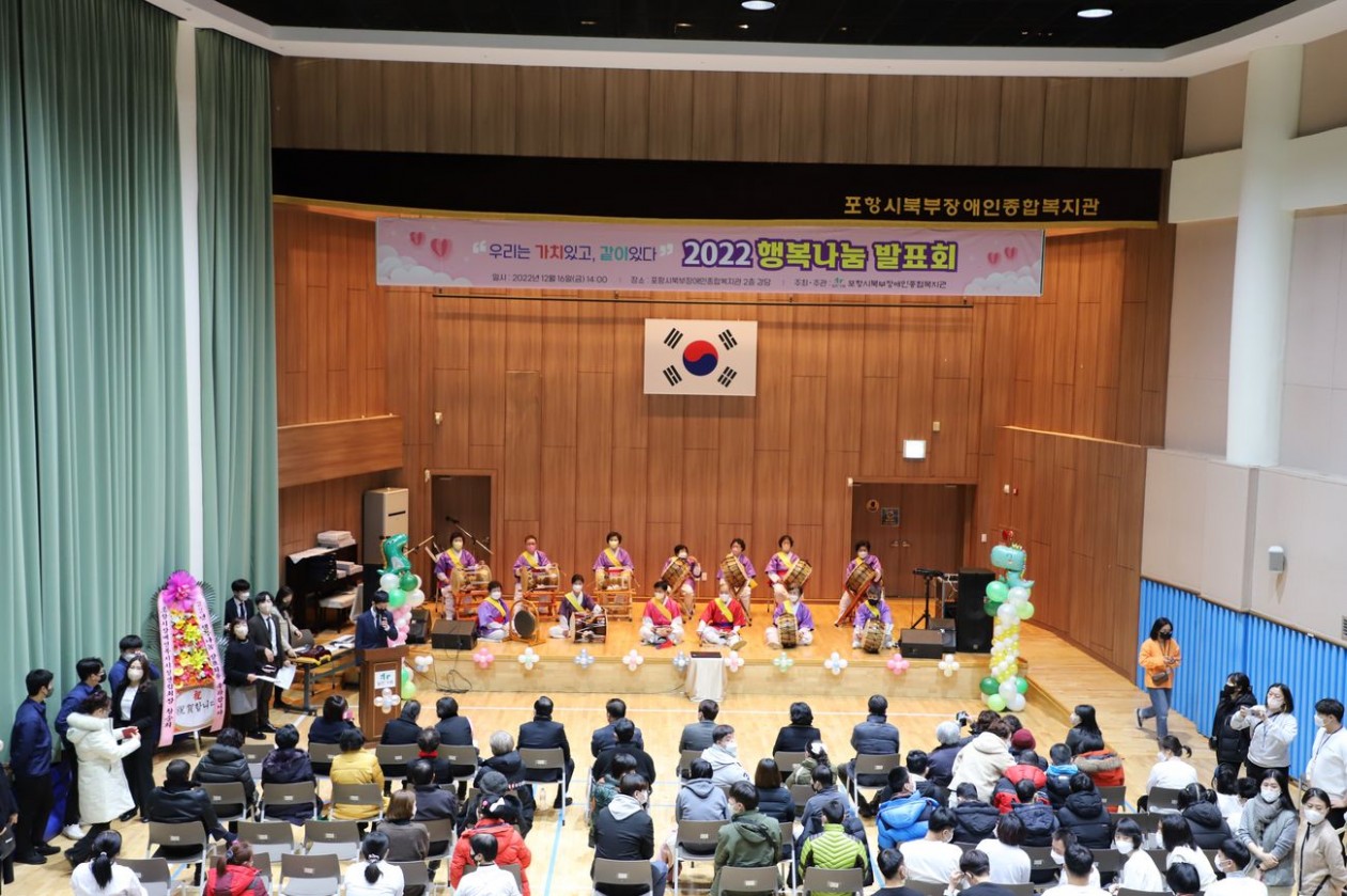 장애인 문화예술교류 및 창작에 대한 잠재능력을 향상시키고 지역주민의 장애인에 대한 인식개선 계기를 마련하기 위해 개최되는 2023 행복나눔 발표회에 포항 지역 내 유관기관 13곳, 150명을 초대하여 그림, 문학, 공예 등의 작품을 전시하고 다양한 공연을 실시하였습니다.