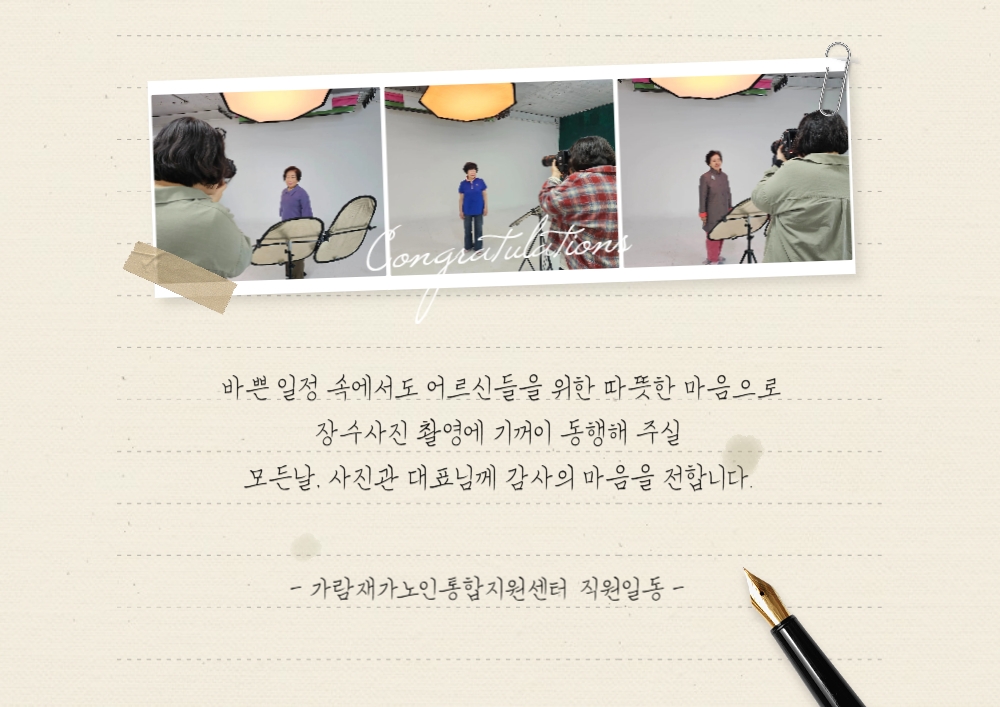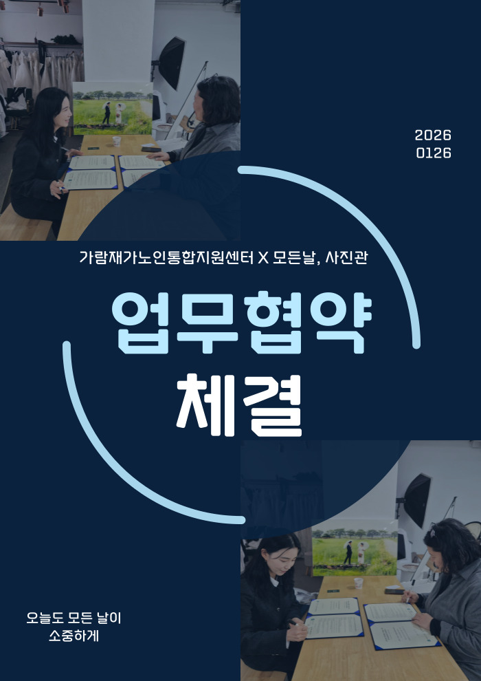 업무협약 체결(가람재가노인통합지원센터X모든날, 사진관) 가람재가노인통합지원센터 노인복지사업 0 15 04.06 11:40 업무협약체결가람재가노인통합지원센터 X 모든날, 사진관가람재가노인통합지원센터와 모든날, 사진관이 어르신들의 소중한 인생을 기록하기 위해 업무협약(MOU)을 체결했습니다.이번 협약을 통해 매달 2명의 어르신께 장수사진 촬영을 지원하며, 오랜 세월을 살아오신 어르신들의 아름다운 오늘을 정성껏 담아드릴 예정입니다.앞으로도 지역사회와 함께 어르신 한 분 한 분의 삶이 더 빛날 수 있도록 노력하겠습니다.