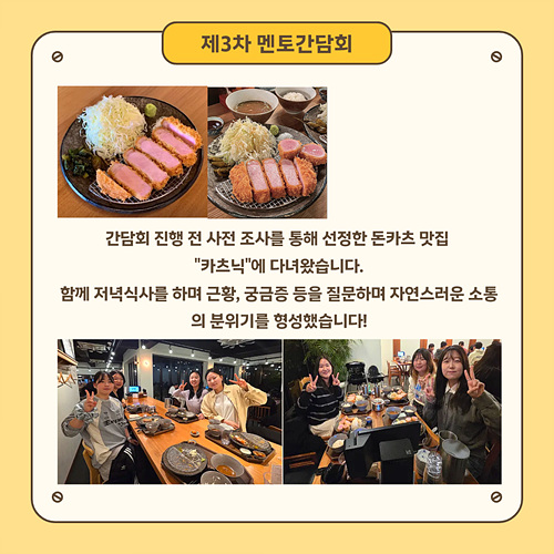 지난 11/5(수), 11/6(목) 외부 식당 및 카페에서 제3차 멘토간담회가 진행되었습니다.