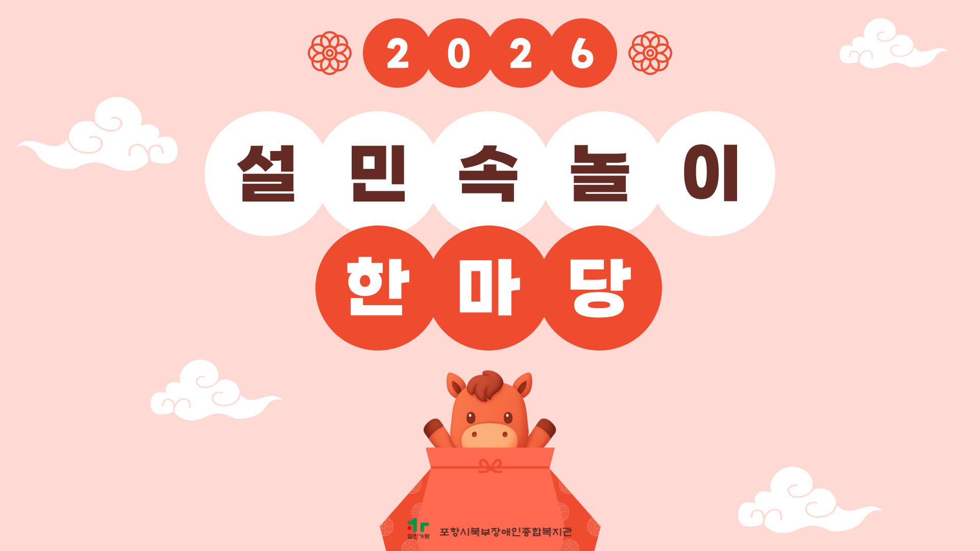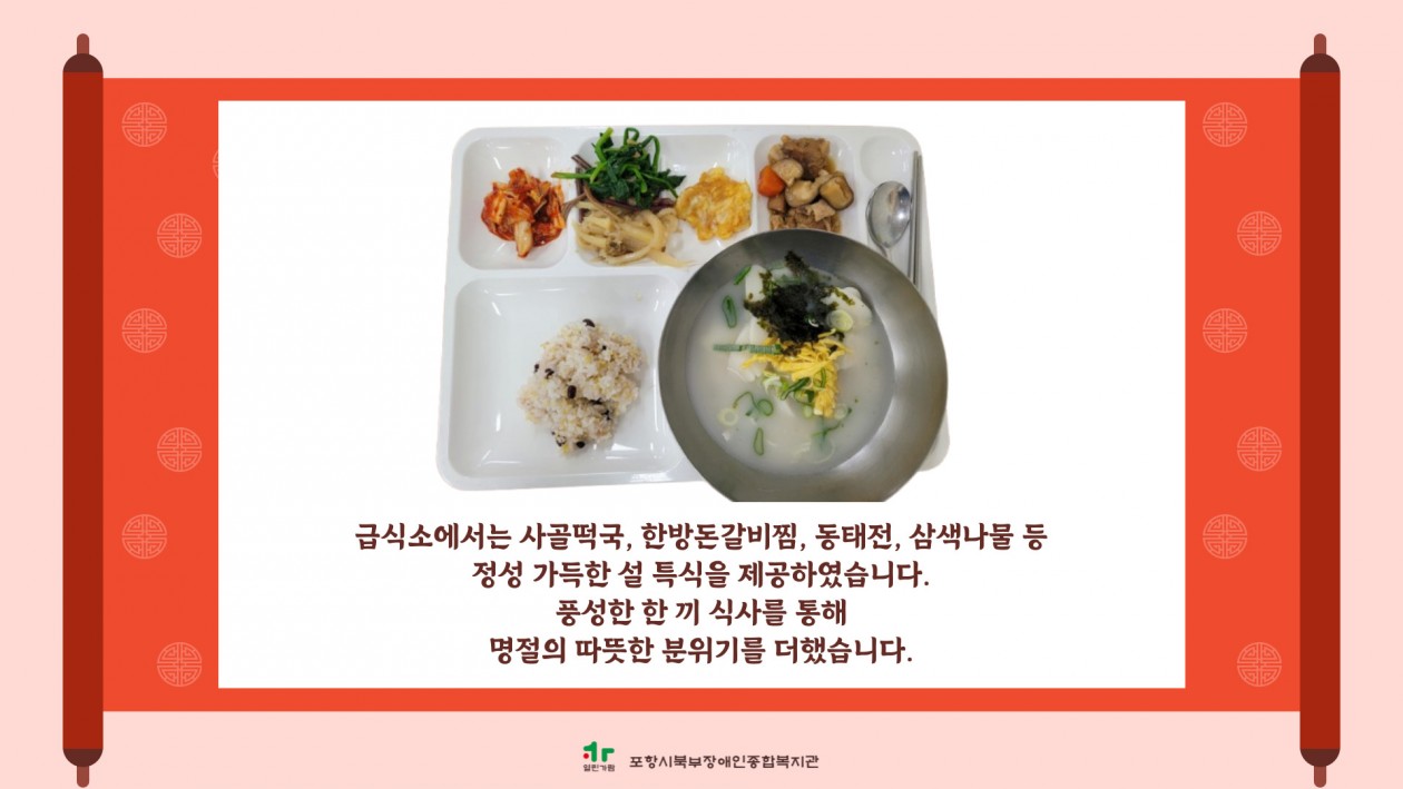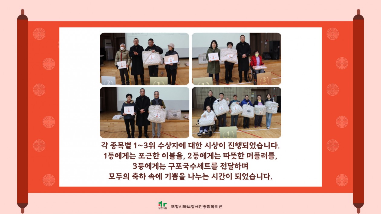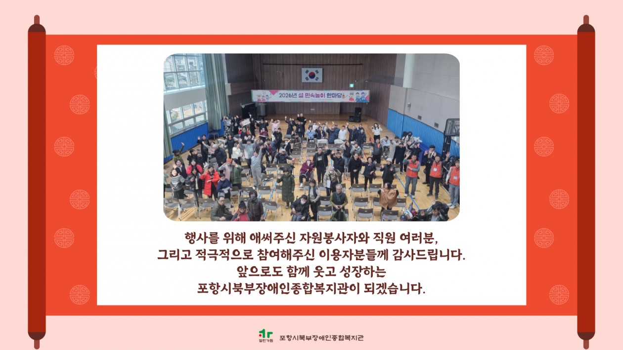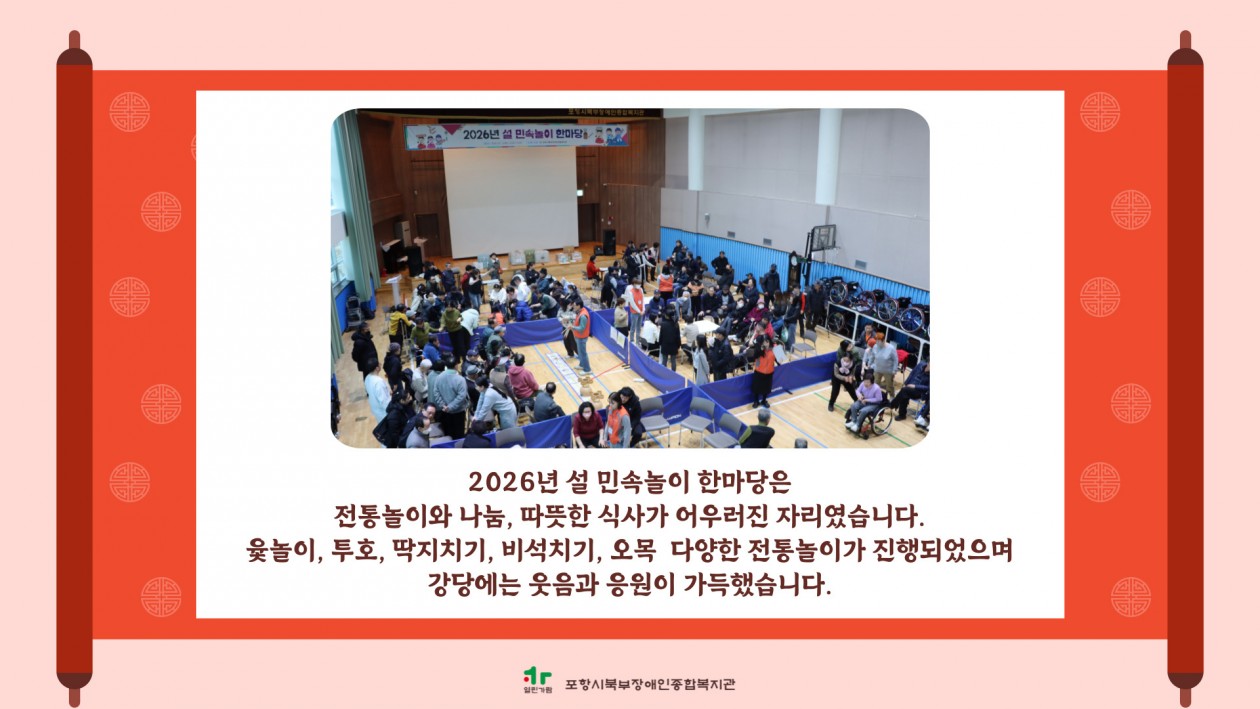 2026년 설 민속놀이 한마당 실시 포항북부장애인복지관 장애인복지사업 0 11 02.13 15:49 [포항시북부장애인종합복지관 2026년 설 민속놀이 한마당 실시] 2월 13일, 설 민속놀이 한마당이 진행되었습니다.전통놀이로 함께 웃고, 나눔으로 마음을 전하며, 따뜻한 식사로 설 명절의 정을 나누었습니다.함께해주신 모든 분들께 감사드립니다. 올 한 해도 건강과 행복이 가득하시길 바랍니다.