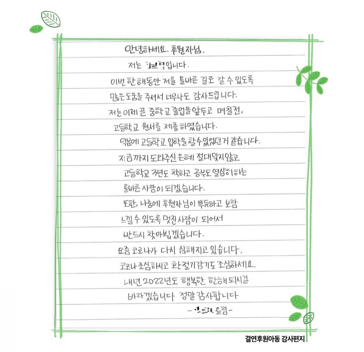 A. 항상 건강하고 바르게만 성장하길 바라요. 공부라는 것도 물론 중요하지만, 할머니 말씀 잘 듣고, 친구들과 잘 어울리며 친구가 성인이 되었을 때, 저와 같이 좋은 마음으로 후원을 할 수 있는 어른이 되었으면 좋겠어요. 항상 응원합니다.^^