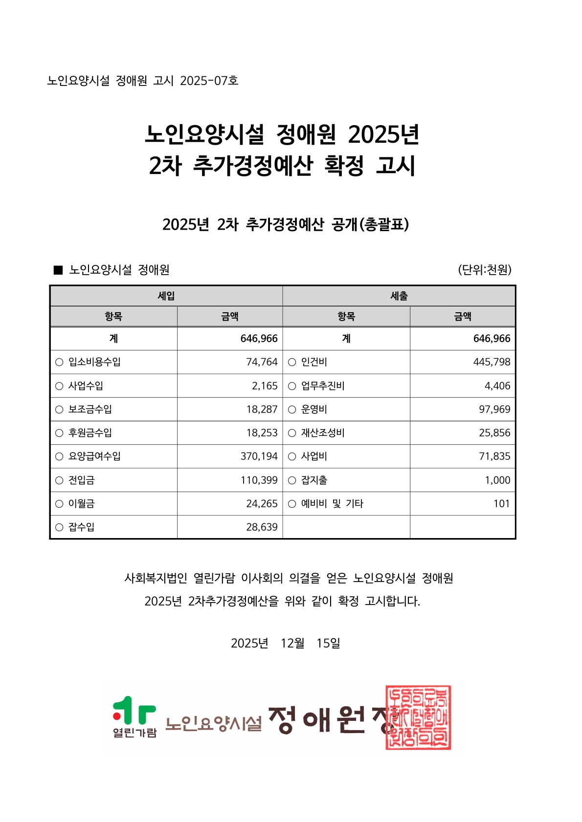 노인요양시설 정애원 2025년도 2차 추가경정예산 확정고시 정애원 0 3 12.15 13:38 2025.12.15 13:38 2. 2025년 2차추경 예산서정애원.pdf (213.4K) + 0